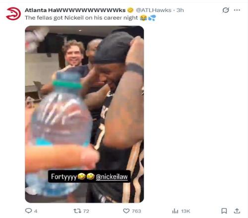 赛后老鹰全队在更衣室朝着亚历山大-沃克疯狂的浇水庆祝,因为沃克才是这场比赛赢球的第一功臣,他打出职业生涯之夜。