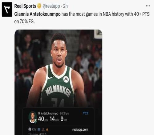 本场比赛再次以至少70%命中率砍下40+得分后,也让字母哥领跑NBA历史该项数据表现纪录。