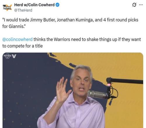 面对这样的局面,FOX体育名嘴Colin Cowher也在节目中建议勇士队在交易截止日前尝试通过6换1交易追求字母哥,以帮助库里全力争夺第五个冠军。