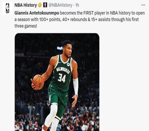 成为NBA历史上首位在开季前三场拿下至少100分40篮板15助攻的球员。