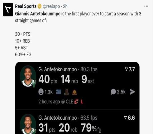 字母哥如此神奇的表现,也是其开赛至今夸张表现的缩影,新赛季至今3场比赛,字母哥一共砍下108分48篮板21助攻,场均36分16板7助。