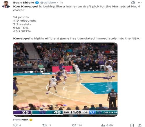 今夏黄蜂用四号签选中克努佩尔时引发了巨大的争议,因为克努佩尔是一个纯投手,防守不佳、持球能力不足、身体对抗不行、尺寸也不足,但目前他在新秀榜上排名是第三的存在。