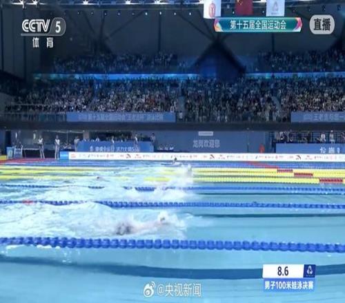 在第十五届全国运动会男子100米蛙泳决赛中,覃海洋代表上海队出战,夺得金牌。(央视新闻)