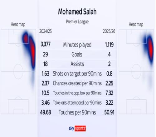 然而,本赛季萨拉赫的表现远未达到确保首发位置的水平,其联赛进球和助攻的效率暴跌过半。正竭力扭转球队颓势的斯洛特,已无法承受任何“乘客”。