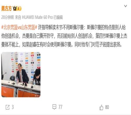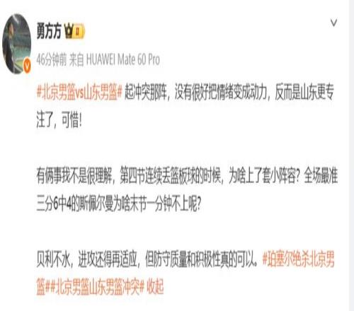 勇方方则表示:有俩事我不是很理解,第四节连续丢篮板球的时候,为啥上了套小阵容?全场最准三分6中4的斯佩尔曼为啥末节一分钟不上呢?